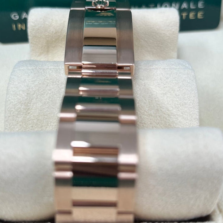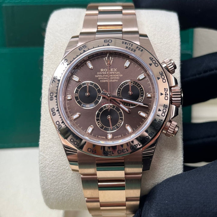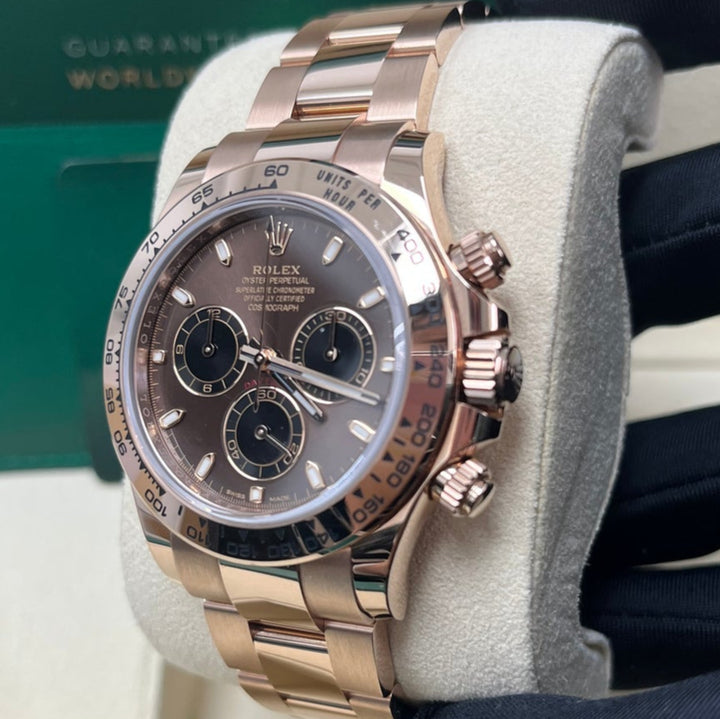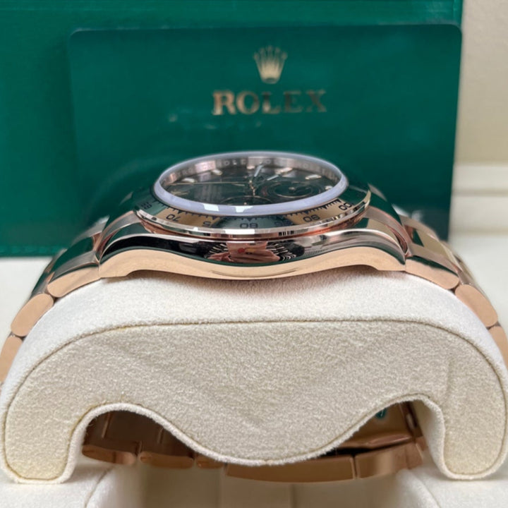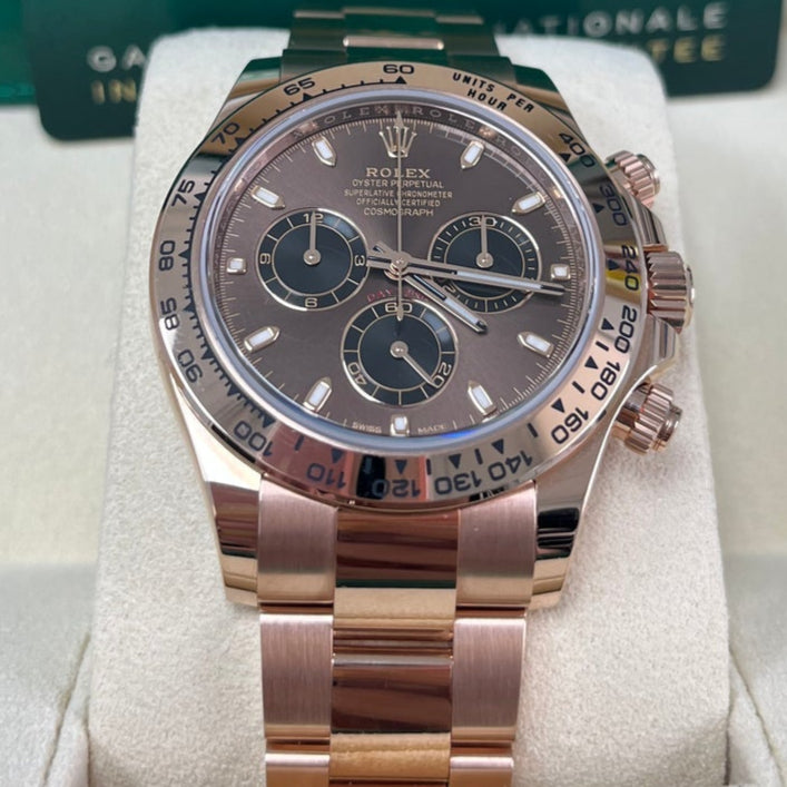 40mm 18K Everose gold case, screw-down crown and push buttons, fixed Everose gold bezel with engraved tachymetric scale, chocolate and black dial, index hour markers, Rolex calibre 4130 automatic movement, 18K Everosed gold Oyster bracelet, folding Oysterlock buckle with Easylink 5mm comfort extension link. Waterproof to 100 meters.
