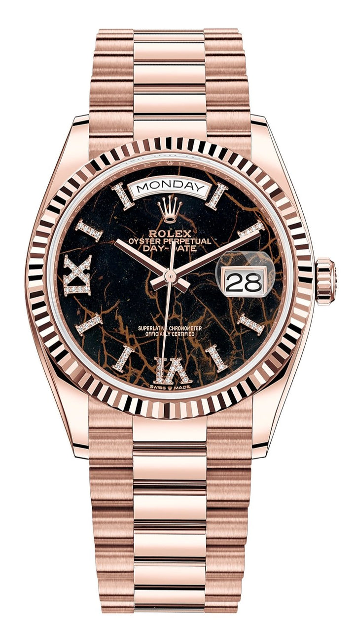 36mm 18K Everose gold case, screw-down back, screw-down crown with twinlock double waterproofness system, fluted bezel, scratch-resistant sapphire crystal with cyclops lens over the date, Eisenkiesel dial, Roman VI and IX set with 24 diamonds, index hours markers set with 32 diamonds, Rolex calibre 3255 perpetual self-winding movement with centre hour, minute and seconds hands, instantaneous day and date in apertures, unrestricted rapid-setting, and stop-seconds for precise time setting, approximately 70 hours of power reserve, 18K Everose gold President bracelet with semi-circular three-piece links, concealed folding Crownclasp buckle. Waterproof to 100 meters.