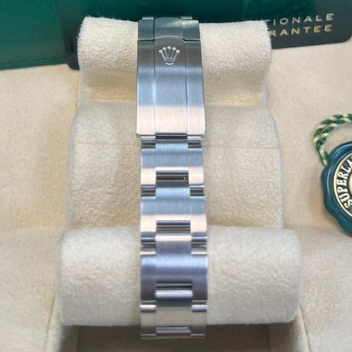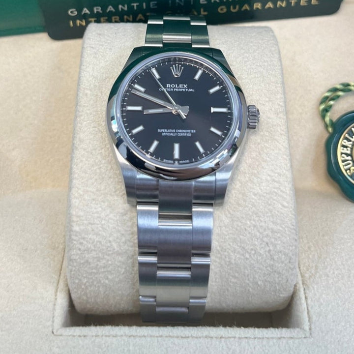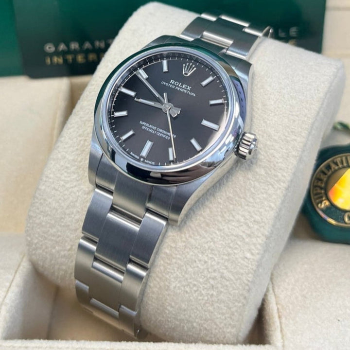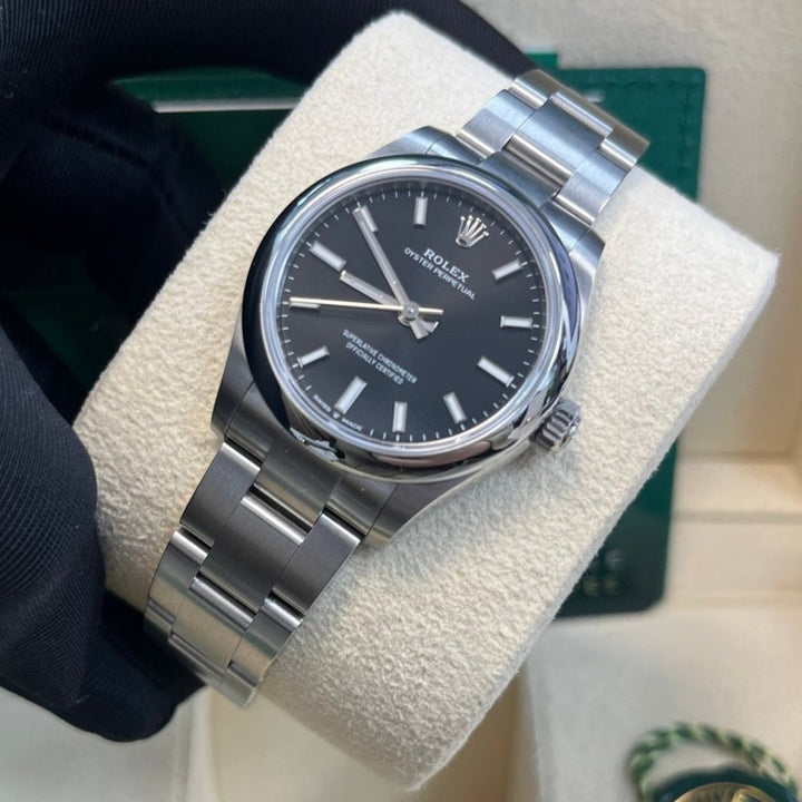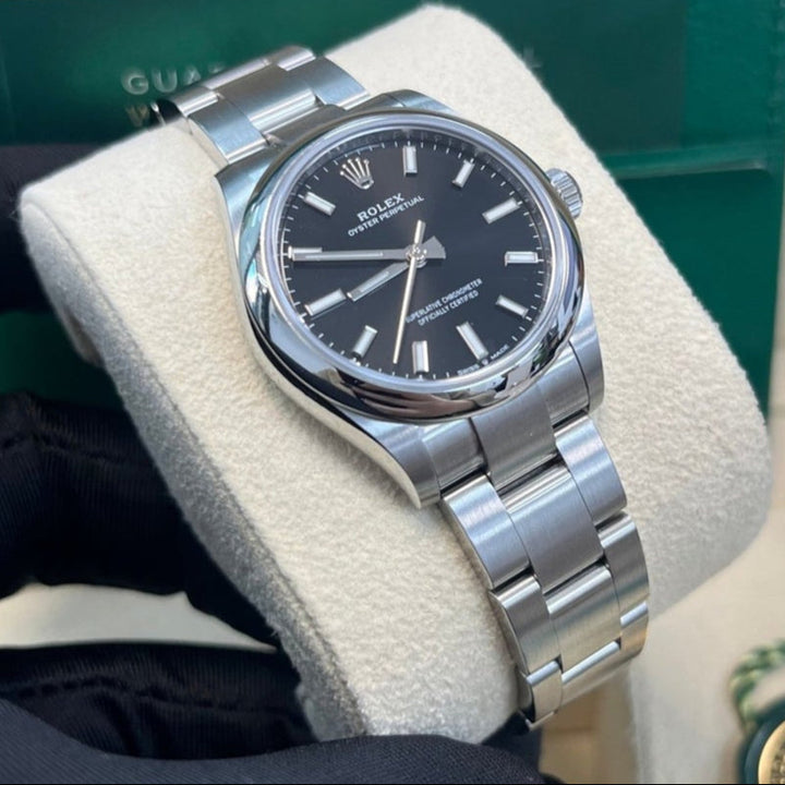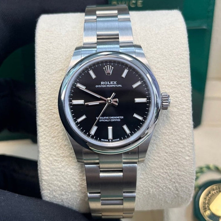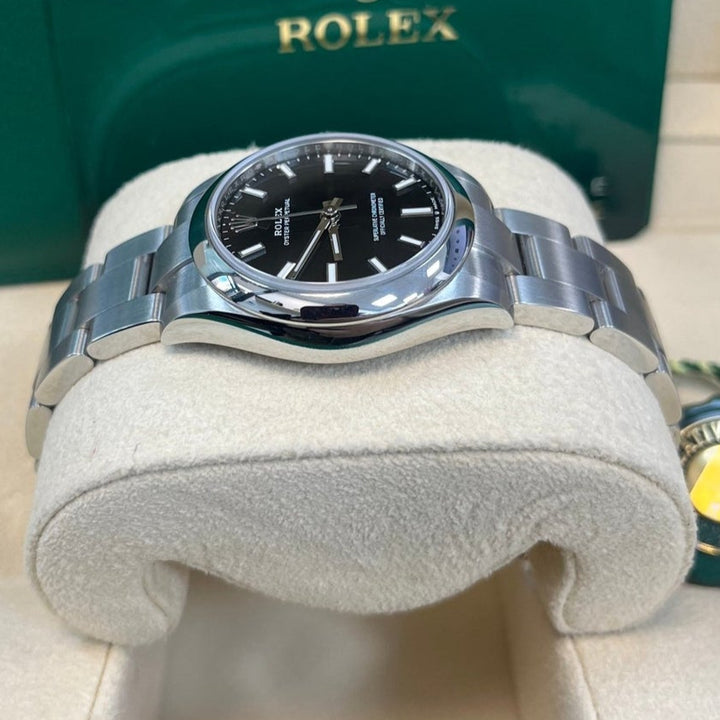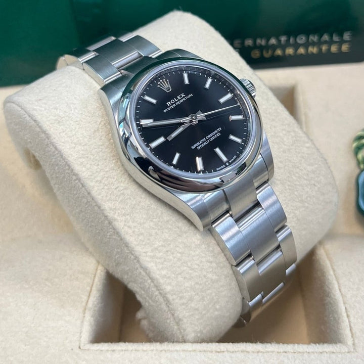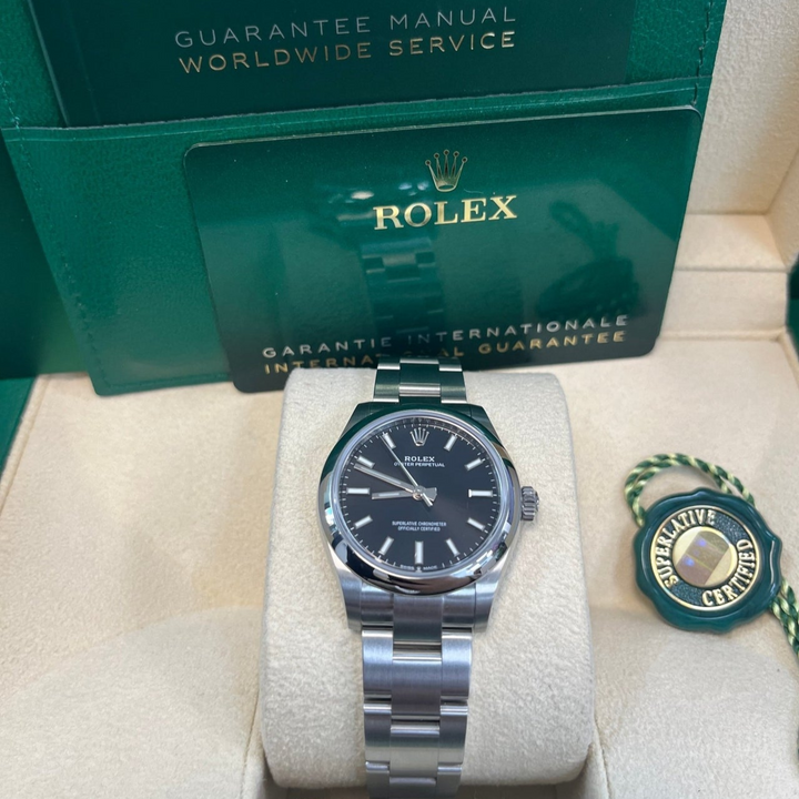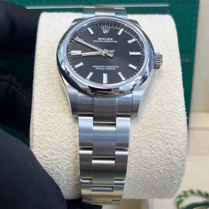 31mm Oystersteel case, screw-down crown with twinlock double waterproofness system, domed bezel, scratch-resistant sapphire crystal, black dial, index hour markers, Rolex calibre 2232 automatic movement with center hour, minute and seconds hands, and stop-seconds for precise time setting, approximately 55 hours of power reserve, Oyster bracelet with flat three-piece links, folding Oysterclasp buckle with Easylink 5mm comfort extension link. Waterproof to 100 meters.