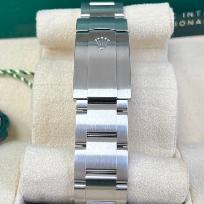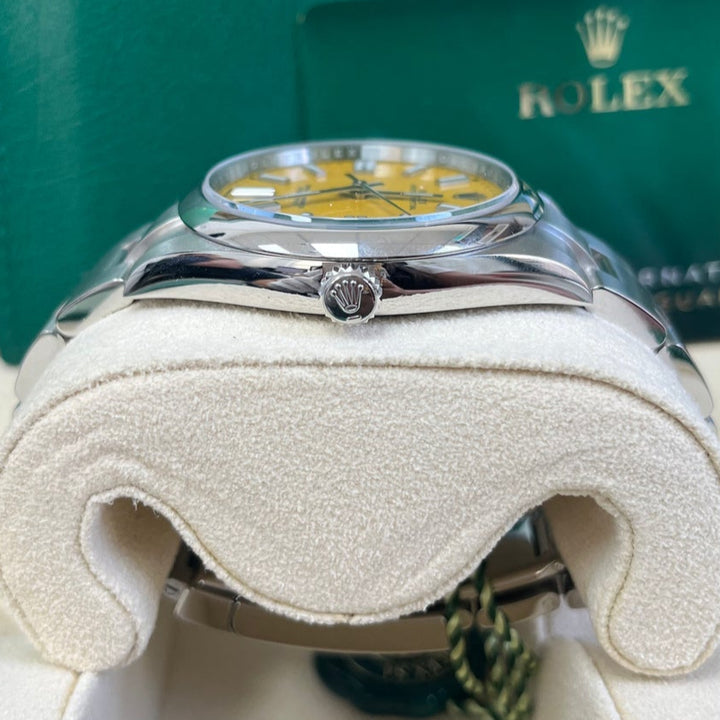 41mm Oystersteel case, screw-down crown with twinlock double waterproofness system, domed bezel, scratch-resistant sapphire crystal, yellow dial, index hour markers, Rolex calibre 3230 automatic movement with center hour, minute and seconds hands, and stop-seconds for precise time setting, approximately 70 hours of power reserve, Oyster bracelet with flat three-piece links, folding Oysterclasp buckle with Easylink 5mm comfort extension link. Waterproof to 100 meters.