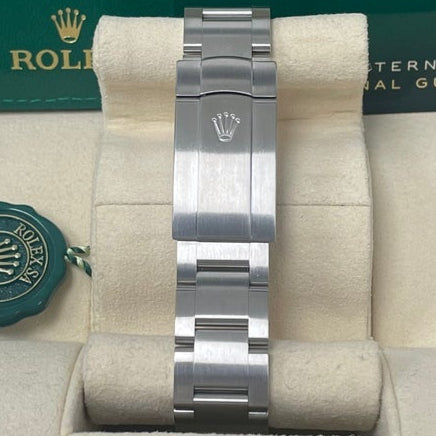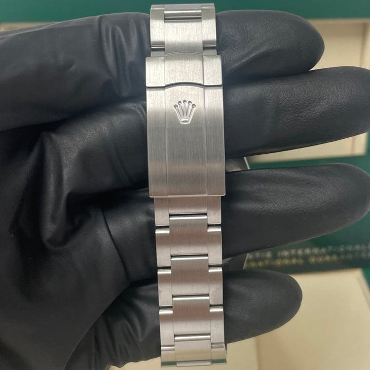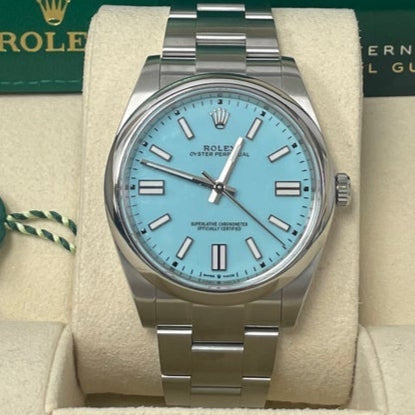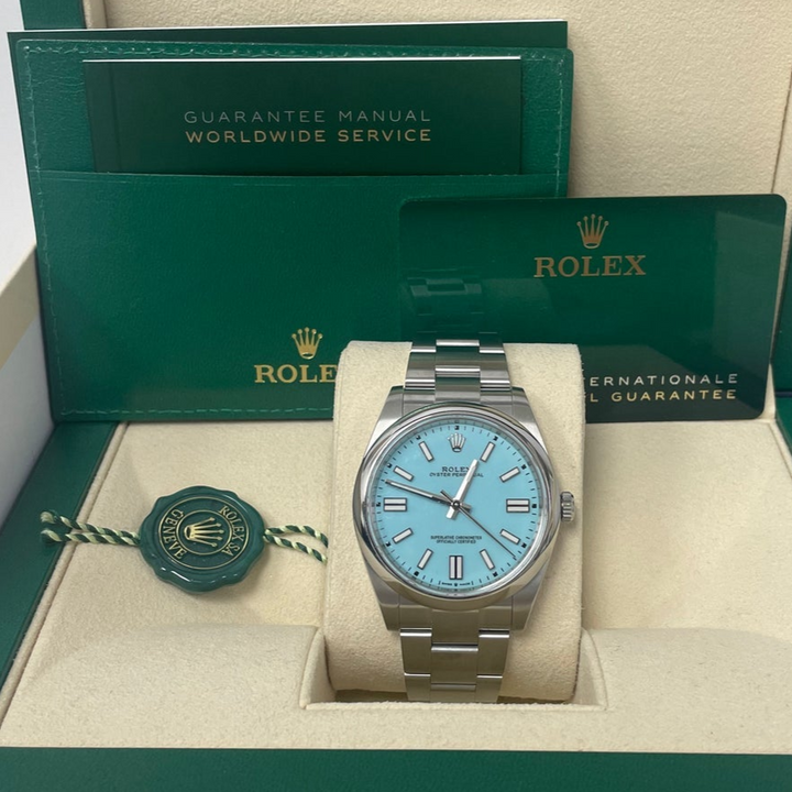 41mm Oystersteel case, screw-down crown with twin lock double waterproofness system, domed bezel, scratch-resistant sapphire crystal, turquoise bright blue dial, index hour markers, Rolex calibre 3230 automatic movement with center hour, minute and seconds hands, and stop-seconds for precise time setting, approximately 70 hours of power reserve, Oyster bracelet with flat three-piece links, folding Oysterclasp buckle with Easylink 5mm comfort extension link. Waterproof to 100 meters.