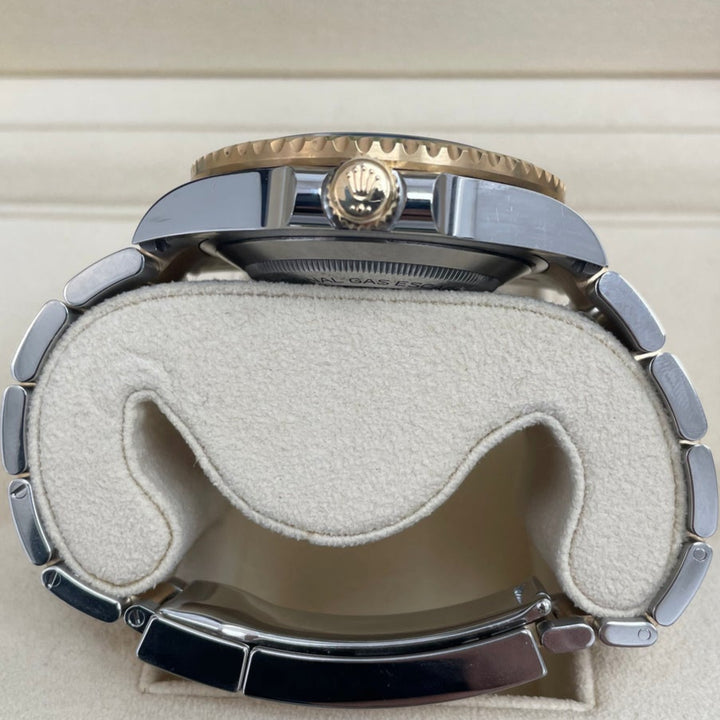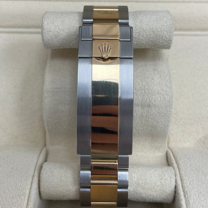 43mm yellow Rolesor case comprised of Oyster steel and 18K yellow gold, screw-down back, screw-down crown with triplock triple waterproofness system, unidirectional rotating bezel with scratch-resistant ceramic Cerachrom insert and yellow gold coated 60-minute graduations and numerals, scratch-resistant sapphire crystal with cyclops lens over the date, black dial, blue Chromalight hour markers, Rolex calibre 3235 self-winding movement with central hour, minutes, seconds, and instantaneous date in aperture, approximately 70 hours of power reserve, yellow Rolesor Oyster bracelet made from a combination of 904L steel and 18K yellow gold with flat three-piece links, folding Oysterlock safety buckle with Rolex glidelock extension system and fliplock extension link. Waterproof to 1,220 meters (4,000 feet). Baselworld 2019 release. 2020.
