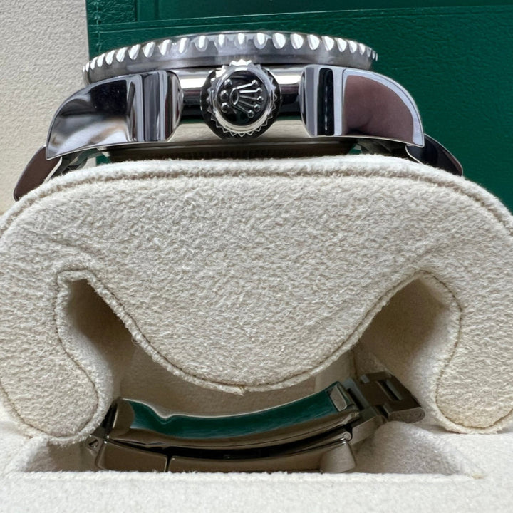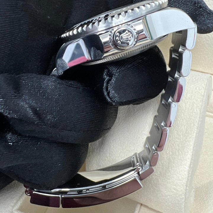 44mm Oyster-Steel case with helium escape valve, screw-down back, screw-down crown, unidirectional rotating bezel with scratch-resistant ceramic Cerachrom insert and platinum-coated 60-minute graduations and numerals, domed 5.5mm thick scratch-resistant crystal, D-Blue dial with a gradient from deep-blue to black. Rolex caliber 3235 perpetual self-winding movements, approximately 70 hours of power reserve, Oyster bracelet with flat three-piece links, folding Oyster-Lock safety buckle with Rolex Glide-Lock extension system and Flip-Lock extension link. Waterproof to 3,900 meters (12,800 feet). Redesigned for Baselworld 2018 with updated case sides, lugs, broader bracelets and clasp, and calibre 3235 movements.