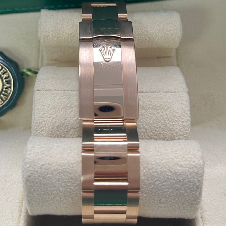 42mm 18K Everose gold case, bidirectional rotatable ring command bezel, chocolate sunray dial, automatic Rolex caliber 9001 movement, second time-zone displayed via off-center rotating disc, Saros annual calendar with date at 3 o'clock and month indicated in discrete apertures at each of the 12 hour marks, 18K Everose gold Oyster bracelet with Oysterclasp and Easylink extension link. Water resistant to 100 meters.