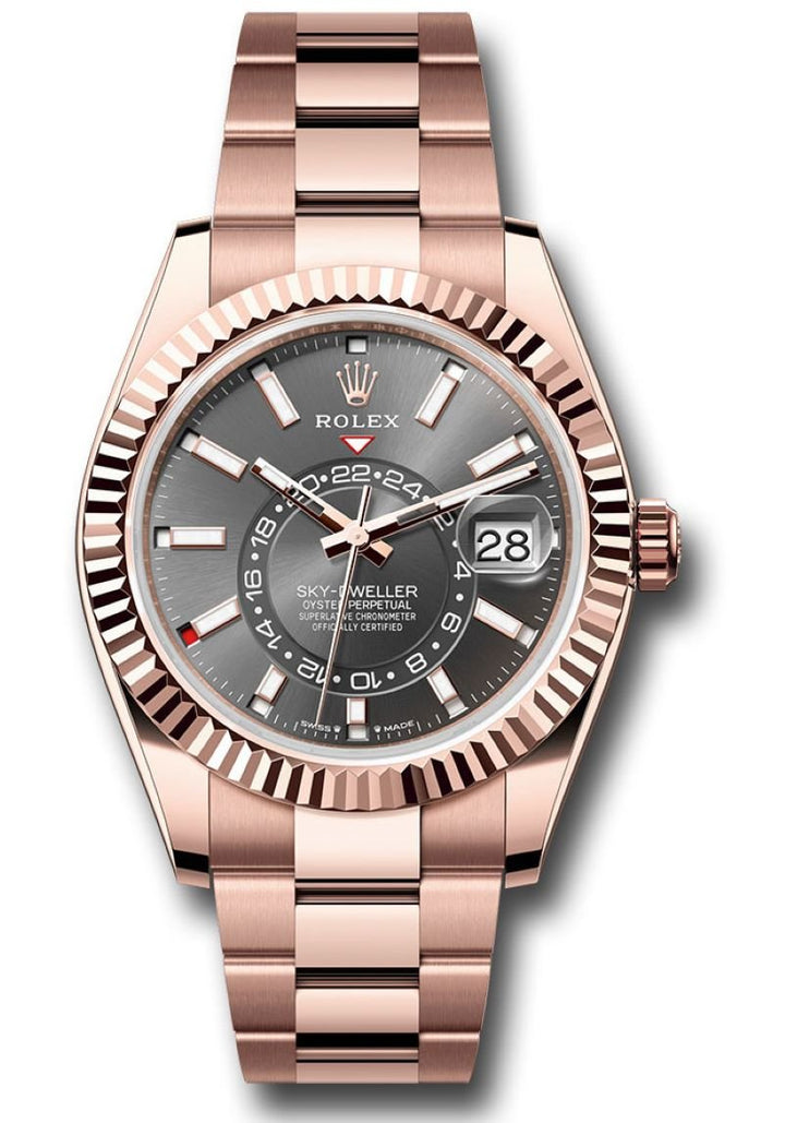 42mm 18K Everose gold case, screw-down back, screw-down crown with twinlock double waterproofness system, fluted, bidirectional rotatable rolex ring command bezel, scratch-resistant sapphire crystal with cyclops lens over the date, slate dial, index hour markers, 9002, manufacture Rolex perpetual self-winding, dual time zones, annual calendar movement with centre hour, minute and seconds hands, 24-hour display on off-centre disc, second time zone, instantaneous annual calendar at 3 o'clock and rapid-setting of the date, month display via 12 apertures around the circumference of the dial, and stop-seconds for precise time setting, approximately 72 hours of power reserve, Oyster bracelet with three-piece solid links, folding Oysterclasp buckle with Easylink 5mm comfort extension link. Waterproof to 100 metres / 330 feet.
