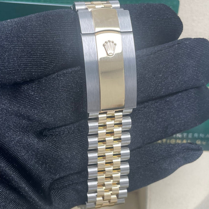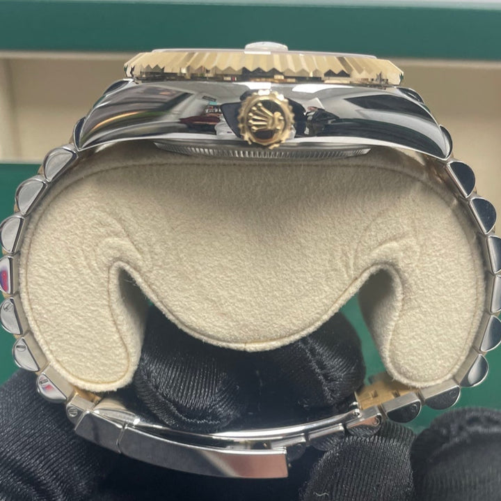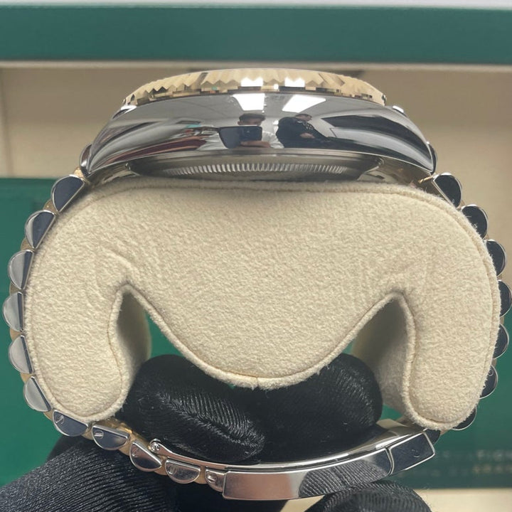 42mm yellow Rolesor case comprised of a 904L steel monobloc middle case, screw-down back, screw-down crown, 18K yellow gold fluted bezel with bidirectional rotatable Rolex Ring Command, scratch-resistant sapphire crystal with cyclops lens over the date and double anti-reflective coating, champagne dial, index hour markers, Rolex calibre 9001 automatic movement , second time-zone displayed via off-center rotating disc, Saros annual calendar with date at 3 o'clock and month indicated in discrete apertures at each of the 12 hour marks, stainless steel and 18K yellow gold Jubilee bracelet, folding Oysterclasp buckle with Easylink 5mm comfort extension link. Waterproof to 100 meters.