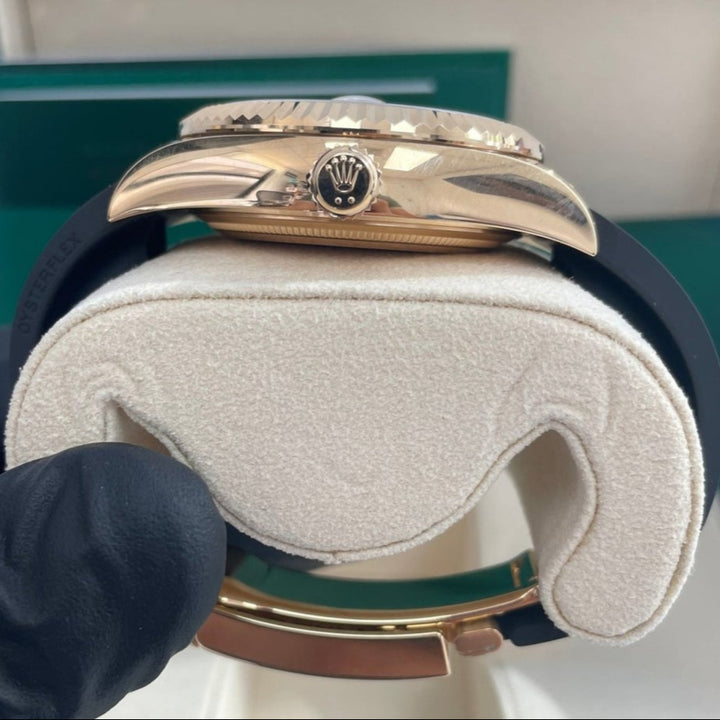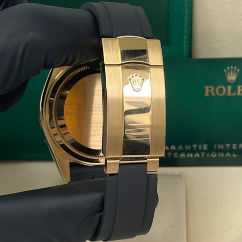42mm 18K yellow gold case, screw-down back, screw-down crown with twinlock double waterproofness system, fluted bezel, scratch-resistant sapphire crystal with cyclops lens over the date, champagne dial, index hour markers, Rolex calibre 9001 automatic movement with 24-hour display on off-centre disc, second time zone, instantaneous annual calendar at 3 o'clock and rapid-setting of the date, month display via 12 apertures around the circumference of the dial, stop-seconds for precise time setting, approximately 72 hours of power reserve, Oysterflex bracelet made from flexible metal blades overmoulded with high-performance elastomer, folding Oysterclasp buckle with glidelock extension system. Waterproof to 100 meters. 2021.