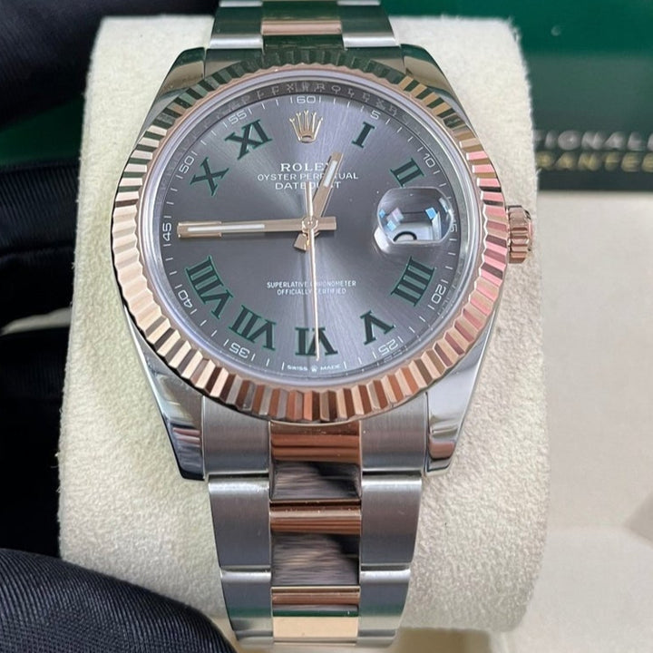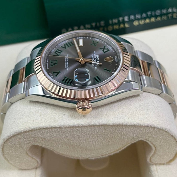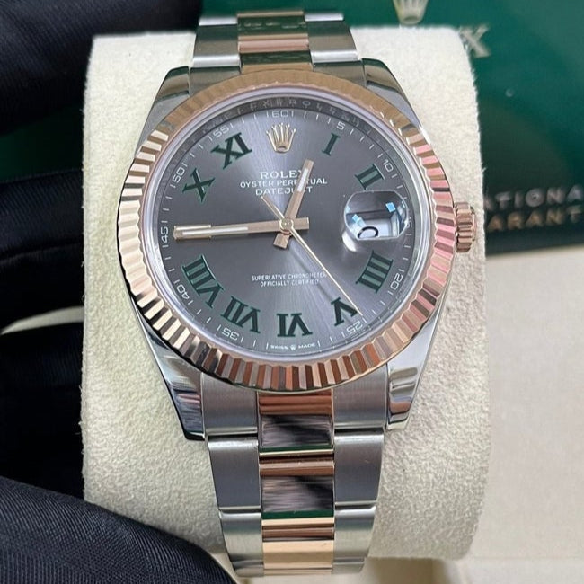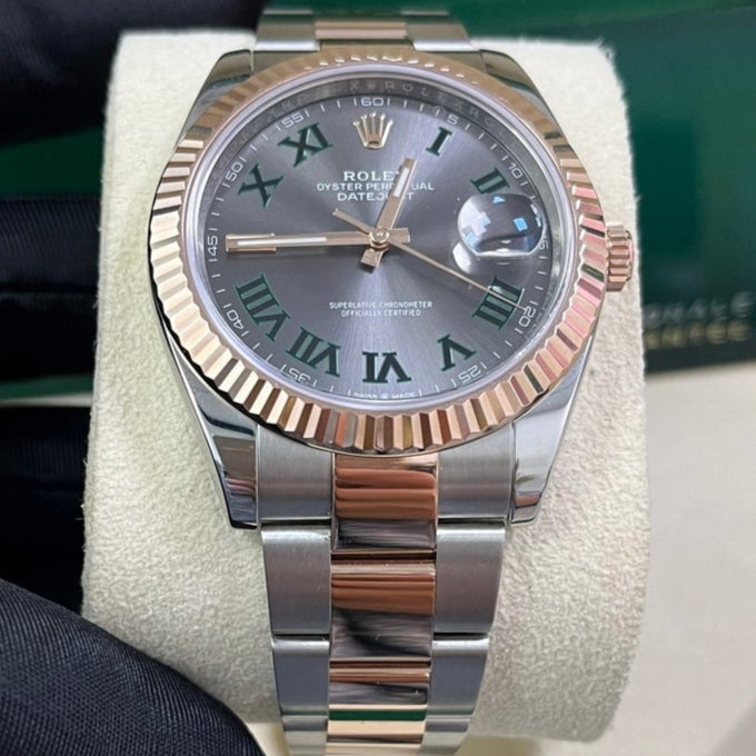 41mm Everose Rolesor case with 904L steel monobloc middle case, screw-down steel back, 18K Everose gold screw-down crown, 18K Everose gold fluted bezel, scratch-resistant double anti-reflective sapphire crystal with cyclops lens over the date, slate gray dial, green Roman numerals, Rolex calibre 3235 perpetual self-winding movement with date at 3 o'clock that changes instantaneously at midnight in a few thousandths of a second, approximately 70 hours of power reserve, Everose Rolesor Oyster bracelet made from a combination of 904L steel and 18K Everose gold with flat three-piece links, folding Oysterclasp buckle with Easylink 5mm comfort extension link. Waterproof to 100 meters.