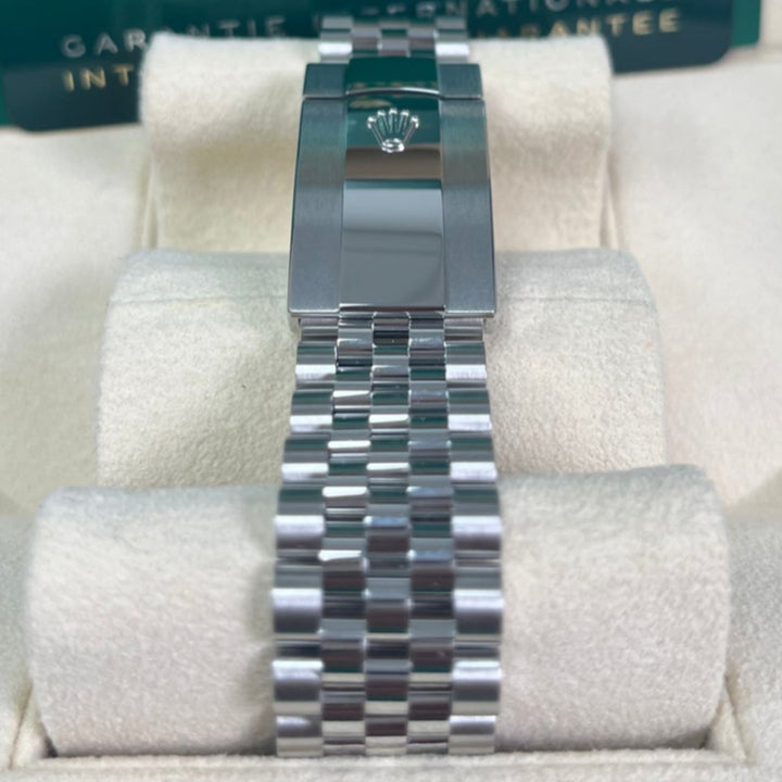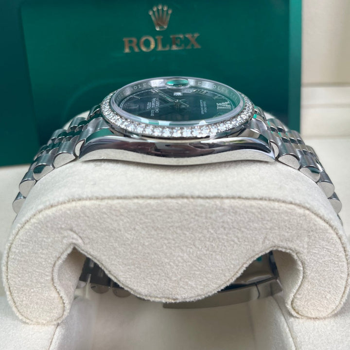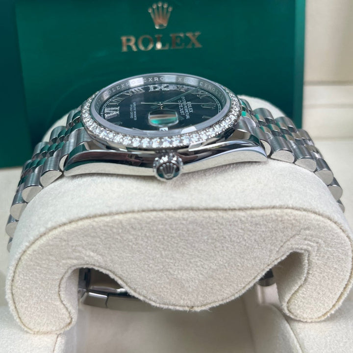 36mm Oystersteel case, screw-down steel back, screw-down crown with twinlock double waterproofness system, diamond bezel, scratch-resistant sapphire crystal with cyclops lens over the date, aubergine dial, Roman numerals with diamond set 6 and 9, Rolex calibre 3235 perpetual self-winding movement with center hour, minute and seconds hands, instantaneous date at 3 o'clock with rapid setting, and stop-seconds for precise time setting, approximately 70 hours of power reserve, Jubilee bracelet with five-piece links, folding Oysterclasp buckle with Easylink 5mm comfort extension link. Waterproof to 100 meters.