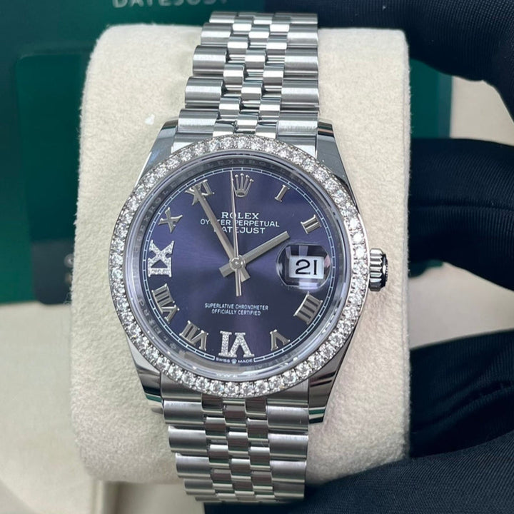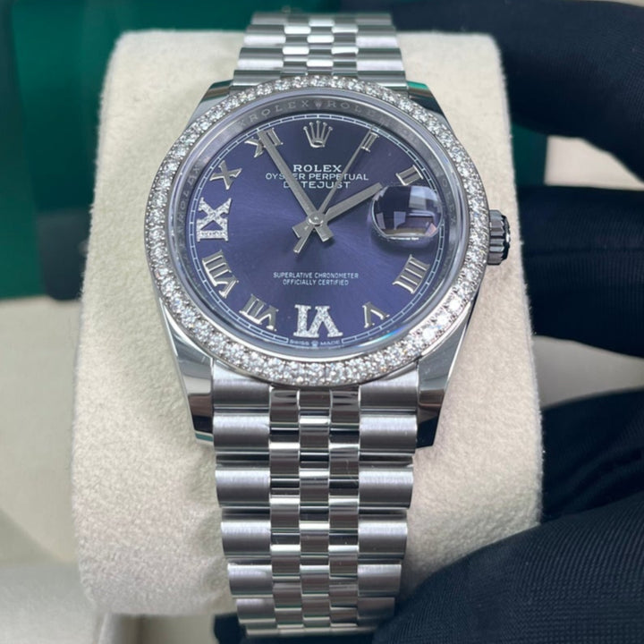 Rolex Steel Datejust 36 Watch - Diamond Bezel - Aubergine Purple Diamond Roman VI and IX Dial - Jubilee Bracelet (Reference #126284rbr)