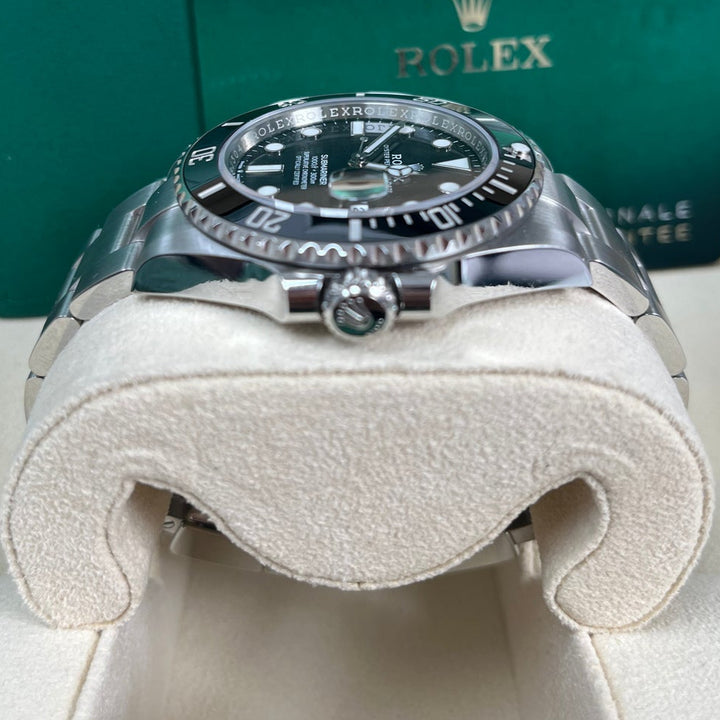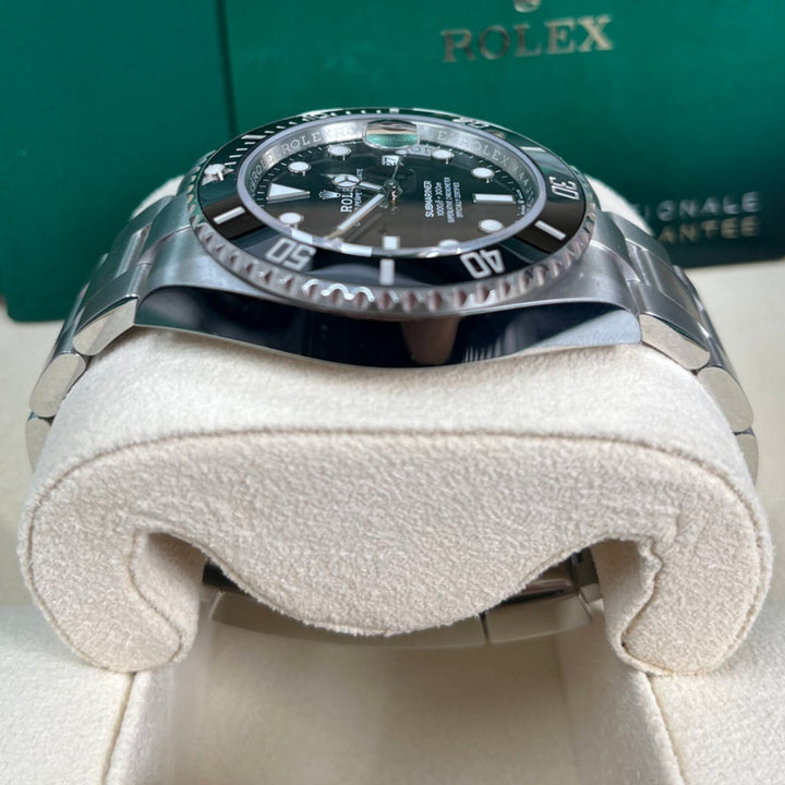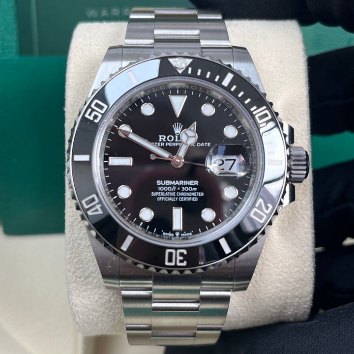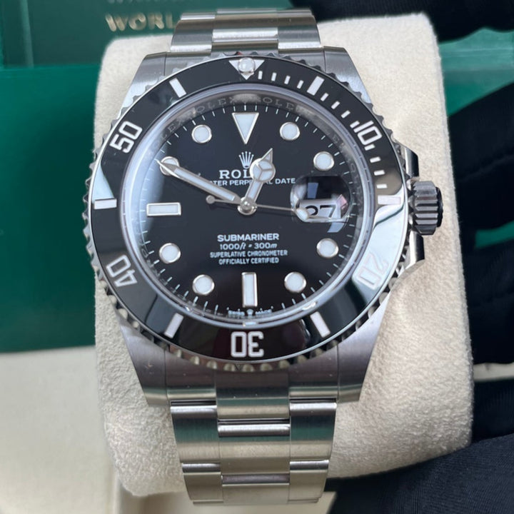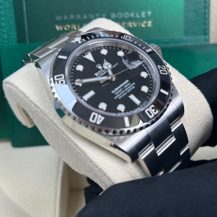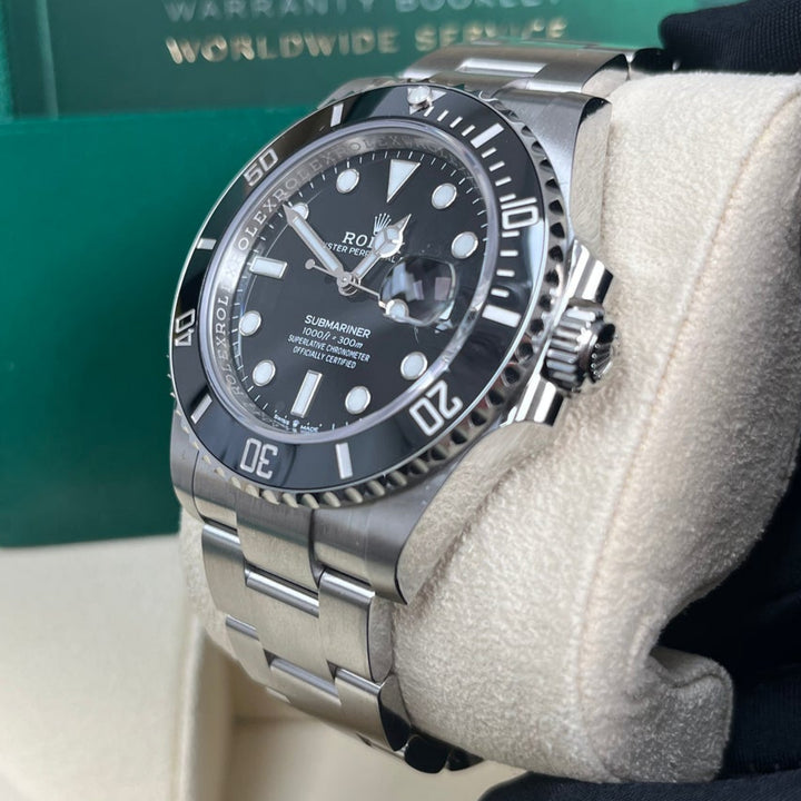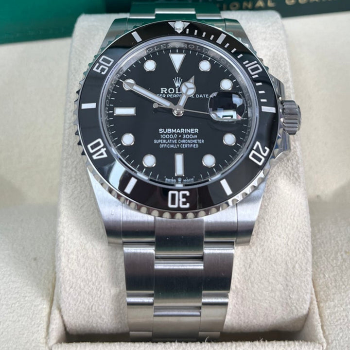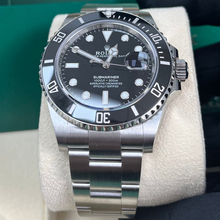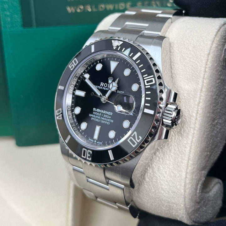 The Rolex Submariner 41mm (126610LN) is a modern icon, featuring a stainless steel case, a striking black dial, and a Cerachrom bezel engineered for ultimate durability. As a professional dive watch, it offers water resistance up to 1,000 feet (300m) and is equipped with Chromalight luminescence for visibility in any environment. The robust Oyster bracelet with Glidelock extension ensures a perfect fit over a wetsuit or on the wrist. Powered by Rolex's calibre 3235 movement, this Submariner combines heritage, precision, and performance in a timeless design.