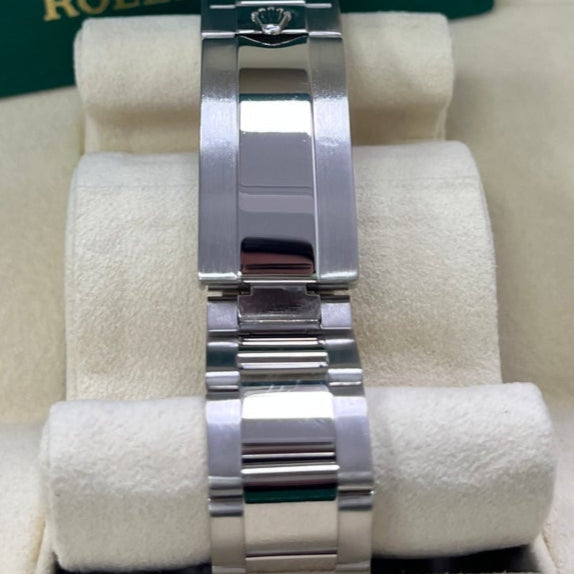 18k white gold case with a white gold-tone 18kt white gold rolex oyster bracelet. Unidirectional rotating blue top ring 18k white gold bezel. Blue dial with silver-tone Mercedes-logo, sword, and Breguet-style shape hands and dot hour markers. Minute markers around the outer rim. Dial Type: Analog. Luminescent hands and dial markers. Date display at the 3 o'clock position. Rolex Calibre 3135 automatic movement with a 50-hour power reserve. Scratch resistant sapphire crystal. Screw down crown. Solid case back. Round case shape. Case size: 40 mm. Oysterlock clasp. Water resistant at 300 meters / 1000 feet. Functions: date, hour, minute, second, chronometer. Luxury watch style. Watch label: Swiss Made.