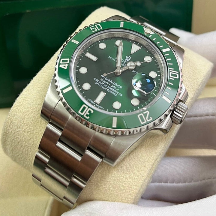 40mm 904L stainless steel case, unidirectional rotatable green Cerachrom time lapse bezel, green Hulk dial, Chromalight luminescent hands and hour markers, and Oyster Glidelock bracelet. Water resistant to 1000 feet. New design introduced at Baselworld 2010. New features include redesigned 904L steel case and virtually scratch proof Cerachom bezel.