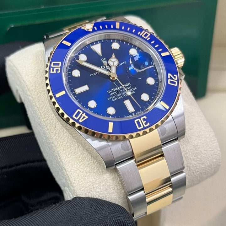 The Rolex Submariner 126613LB is a stunning two-tone timepiece crafted from 18K yellow gold and Oystersteel. Featuring a 41mm case, Cerachrom blue bezel, and scratch-resistant sapphire crystal, this model offers a caliber 3235 movement with a 70-hour power reserve. Designed for both luxury and adventure, it boasts 300m water resistance and a Glidelock clasp for perfect sizing.