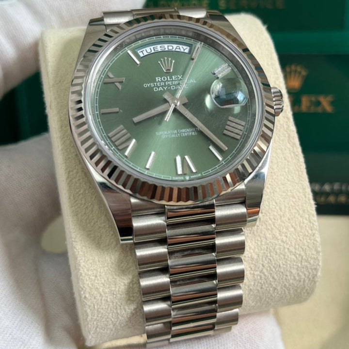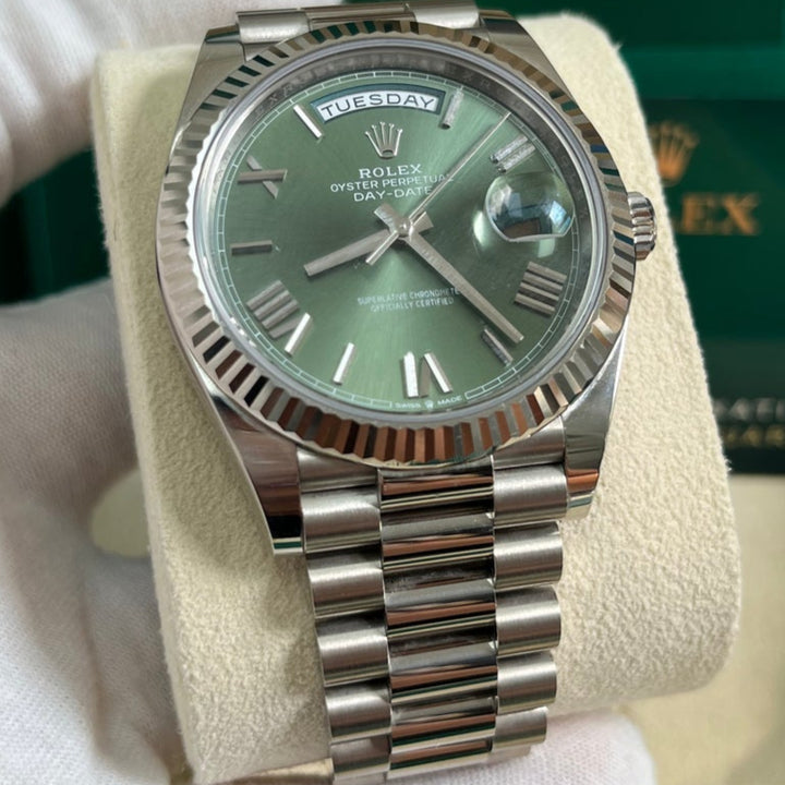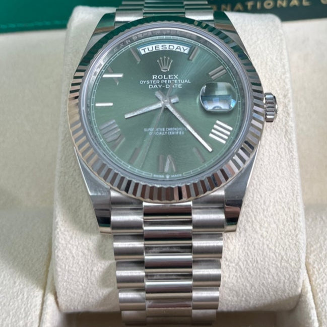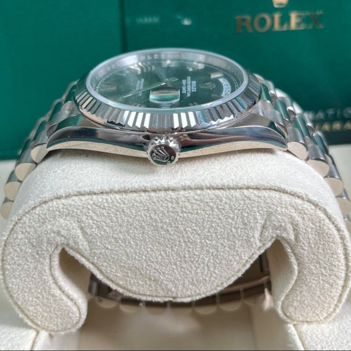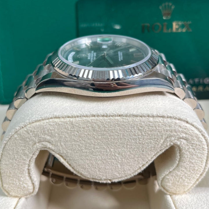 Rolex White Gold Day-Date 40 Watch - Fluted Bezel - Olive Green Bevelled Roman Dial - President Bracelet (Ref# 228239)