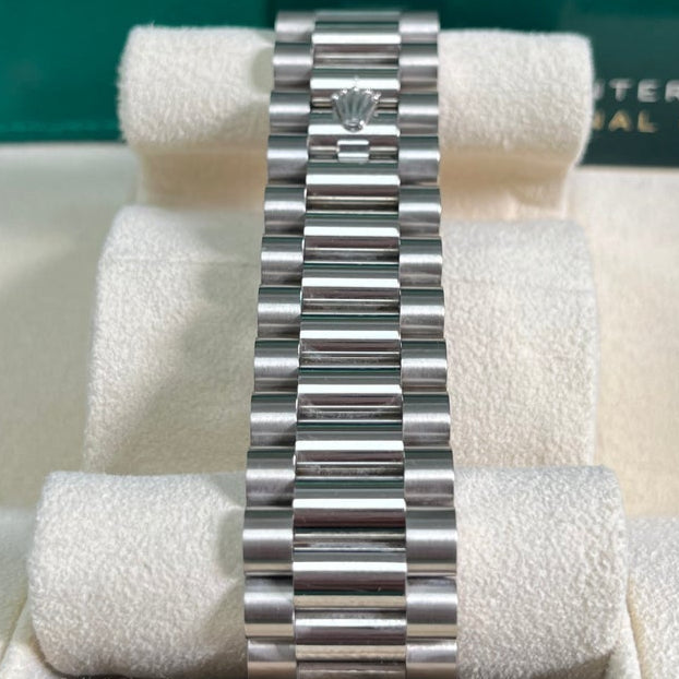 40mm 18K white gold case, screw-down back with Rolex fluting, screw-down crown with twinlock double waterproofness system, fluted bezel, scratch-resistant double anti-reflective sapphire crystal with cyclops lens over the date, olive green dial, bevelled deconstructed Roman numerals, Rolex calibre 3255 automatic movement with centre hour, minute and seconds hands, instantaneous day and date in apertures, unrestricted rapid-setting, and stop-seconds for precise time setting, approximately 70 hours of power reserve, President bracelet with three-piece solid links comprised of a polished center link, satin-finished outer links, and ceramic inserts, concealed folding Crownclasp buckle. Waterproof to 100 meters. 2020.