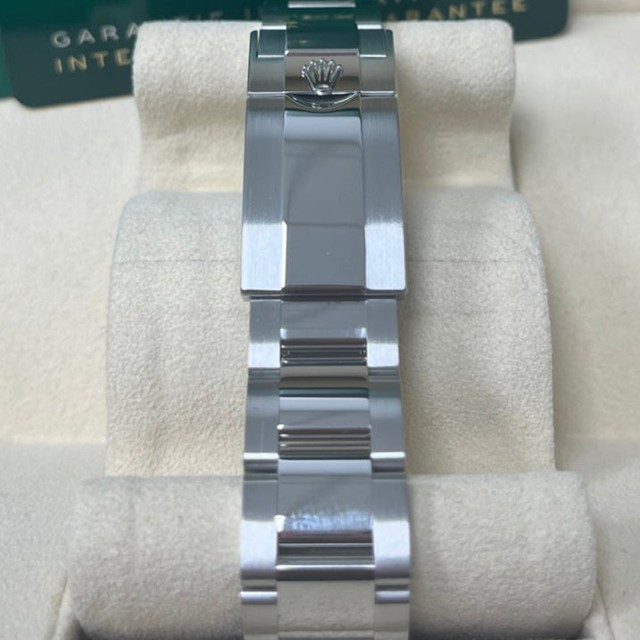 40mm Rolesium case comprised of a 904L steel monobloc middle case, screw-down steel back, screw-down steel crown, 950 platinum bidirectional rotatable bezel with raised polished numerals and graduations over a sand-blasted background, scratch-resistant sapphire crystal with cyclops lens over the date, dark rhodium dial, white gold applied hour markers with blue Chromalight luminescence, Rolex calibre 3135 automatic movement, approximately 48 hours of power reserve, stainless steel Oyster bracelet with flat three-piece links, folding Oysterlock buckle with Easylink 5mm comfort extension link. Waterproof to 100 meters.