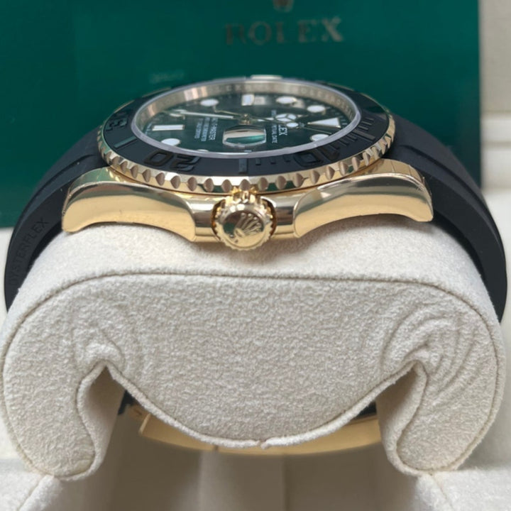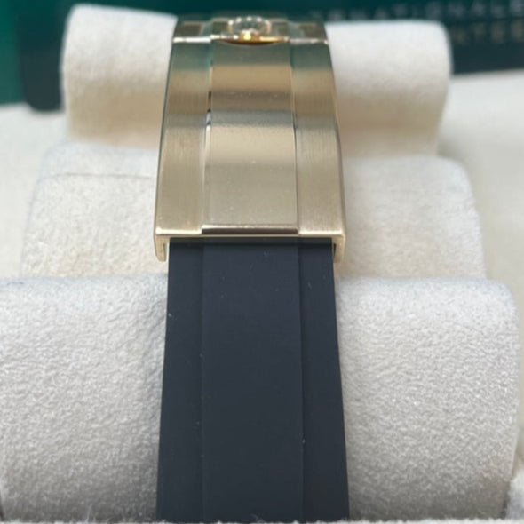 42mm 18K yellow gold case, screw-down back, screw-down crown with triplock triple waterproofness system, bidirectional rotatable 60-minute graduated bezel with matt black cerachrom insert in ceramic, polished raised numerals and graduations bezel, scratch-resistant sapphire crystal with cyclops lens over the date, black dial, Rolex calibre 3235 perpetual self-winding movement with centre hour, minute and seconds hands, instantaneous date with rapid setting, and stop-seconds for precise time setting, approximately 70 hours of power reserve, Oysterflex strap made from flexible metal blades overmoulded with high-performance elastomer, folding Oysterlock safety buckle with rolex glidelock extension system. Waterproof to 100 metres / 330 feet.