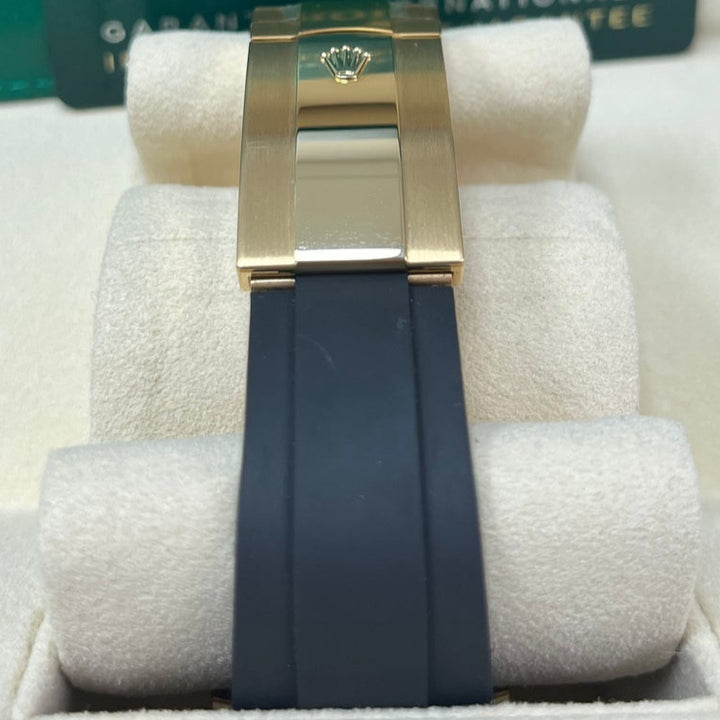 42mm 18K yellow gold case, screw-down back, screw-down crown with twinlock double waterproofness system, fluted bezel, scratch-resistant sapphire crystal with cyclops lens over the date, bright black dial, index hour markers, Rolex calibre 9001 automatic movement with 24-hour display on off-centre disc, second time zone, instantaneous annual calendar at 3 o'clock and rapid-setting of the date, month display via 12 apertures around the circumference of the dial, stop-seconds for precise time setting, approximately 72 hours of power reserve, Oysterflex bracelet made from flexible metal blades overmoulded with high-performance elastomer, folding Oysterclasp buckle with glidelock extension system. Waterproof to 100 meters. 2020.