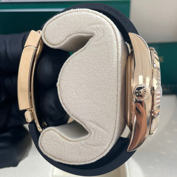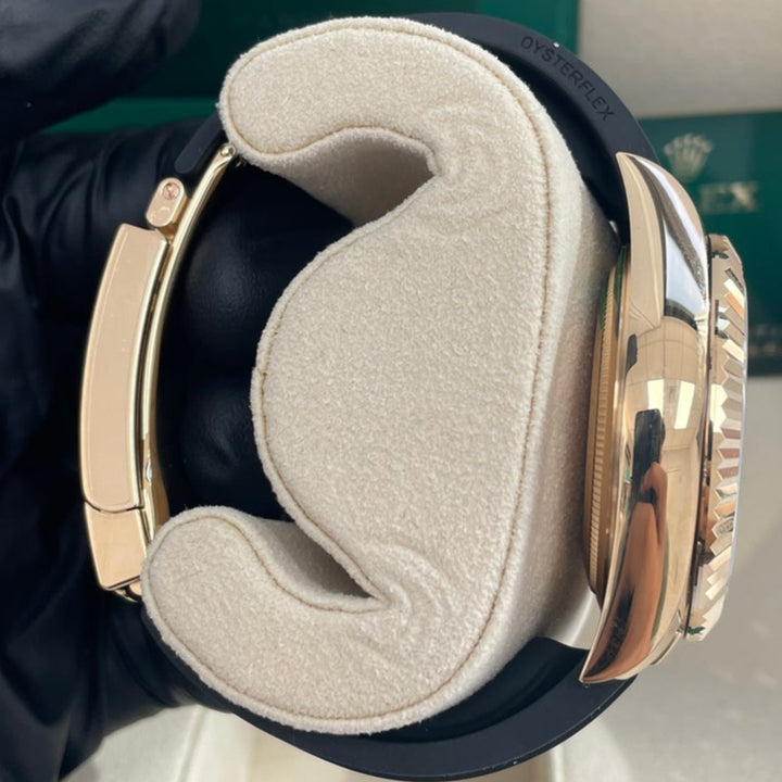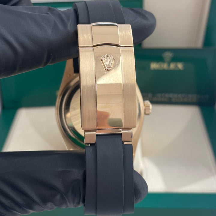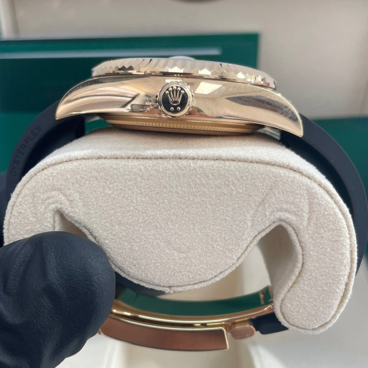 42mm 18K yellow gold case, screw-down back, screw-down crown with twinlock double waterproofness system, fluted bezel, scratch-resistant sapphire crystal with cyclops lens over the date, white dial, index hour markers, Rolex calibre 9001 automatic movement with 24-hour display on off-centre disc, second time zone, instantaneous annual calendar at 3 o'clock and rapid-setting of the date, month display via 12 apertures around the circumference of the dial, stop-seconds for precise time setting, approximately 72 hours of power reserve, Oysterflex bracelet made from flexible metal blades overmoulded with high-performance elastomer, folding Oysterclasp buckle with glidelock extension system. Waterproof to 100 meters.